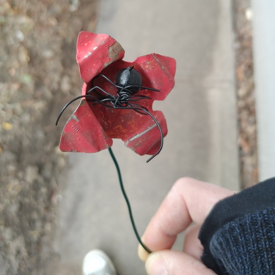 I made this one morning killing time. It jiggles. It is an old bell bent into the shape of flower petals connected to a wire. The spider inside of it was made from a bead and some plastic coated wire.